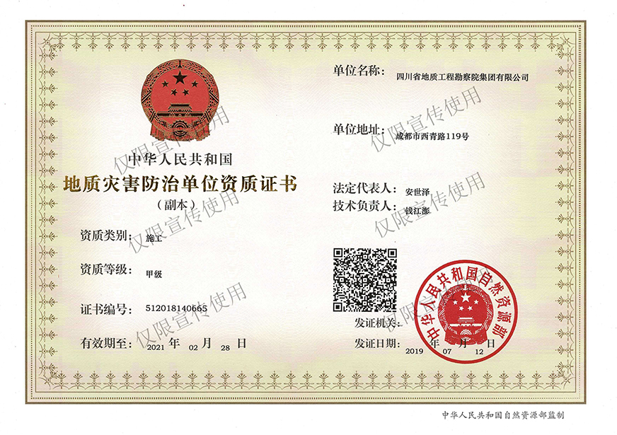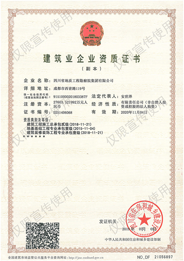 川勘集團(tuán)擁有工程勘察綜合類,地質(zhì)勘查,測(cè)繪,地質(zhì)災(zāi)害評(píng)估和治理工程勘查設(shè)計(jì)、施工、監(jiān)理,城鄉(xiāng)規(guī)劃編制,水利行業(yè)設(shè)計(jì),環(huán)境工程專業(yè)設(shè)計(jì),水利水電工程、建筑工程、市政公用工程、公路工程施工總承包,地基基礎(chǔ)工程、建筑裝修裝飾工程、環(huán)保工程專業(yè)承包,檢驗(yàn)檢測(cè)機(jī)構(gòu)(CMA),水資源論證,水文與水資源調(diào)查評(píng)價(jià),土地規(guī)劃?rùn)C(jī)構(gòu),四川省環(huán)境污染防治工程等級(jí)評(píng)價(jià)、地震安全評(píng)價(jià)等甲(壹)、乙(貳)級(jí)資質(zhì)、行業(yè)認(rèn)證30余項(xiàng)。